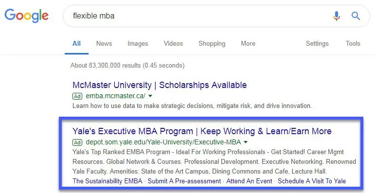 Example: This ad for Yale’s Executive MBA program, which is shown in a search for ‘flexible MBA’, is specifically aimed at prospects who want to work while obtaining their degree.