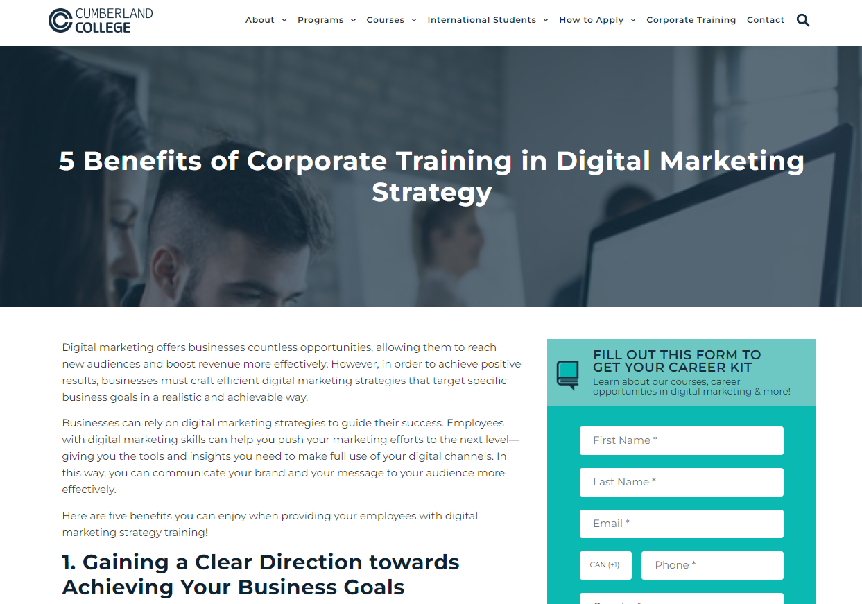 Example: Cumberland College has created an evergreen blog post to appeal to prospects considering corporate training. The blog post dives into the top benefits of gaining professional training in digital marketing strategy, informing businesses on a topic that will continue to remain relevant over time: