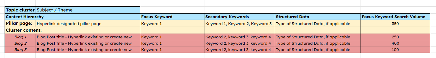 Example: The template below shows how to organize your school’s content when creating your topic clusters. Here, you can clearly define the subject or theme, designate a pillar page, list relevant blog posts, and include structured data all in one place. You can also assign the appropriate keywords and make note of their search volume: