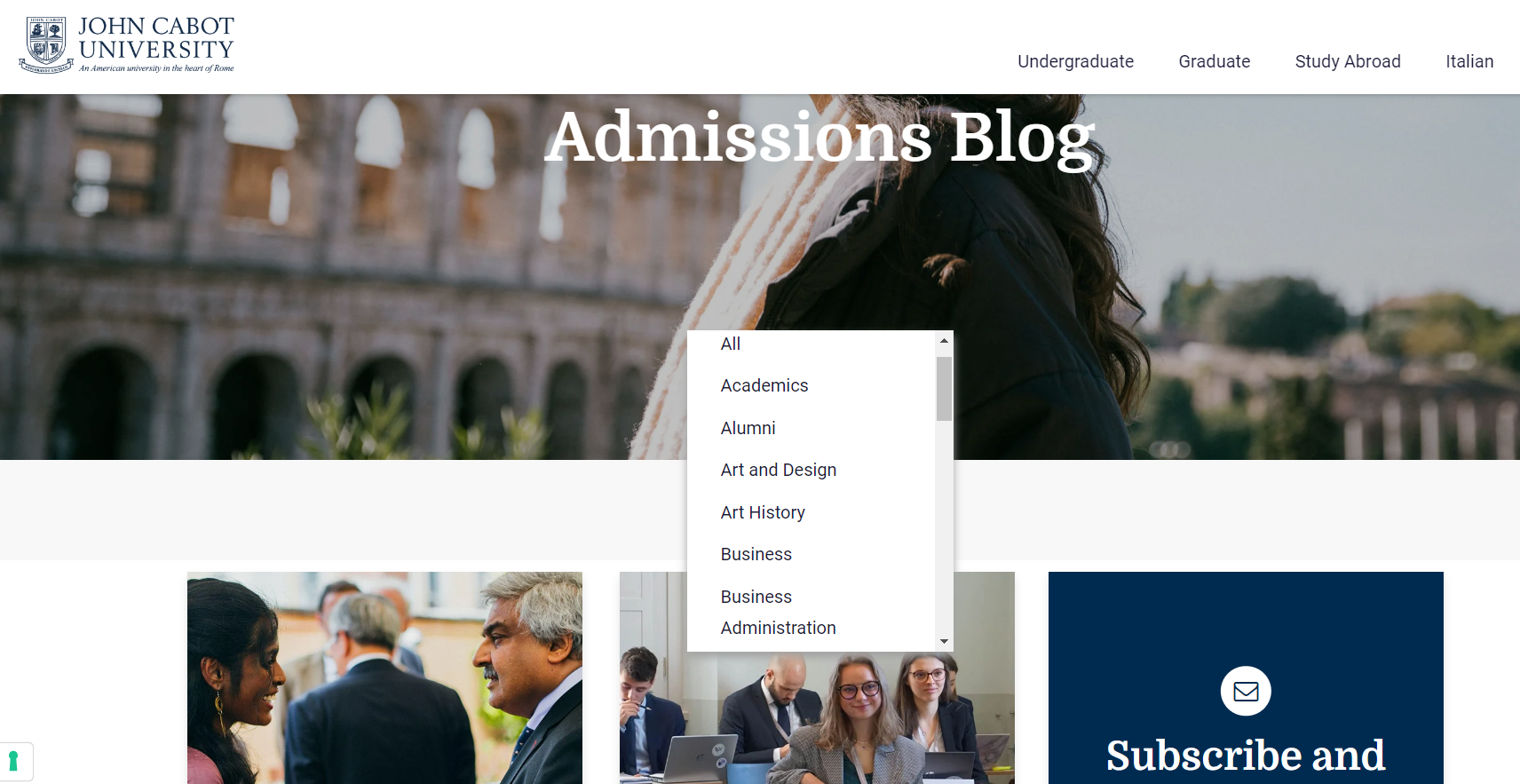 Example: John Cabot University’s blog covers a wide range of topics that prospects can explore via the drop-down menu: