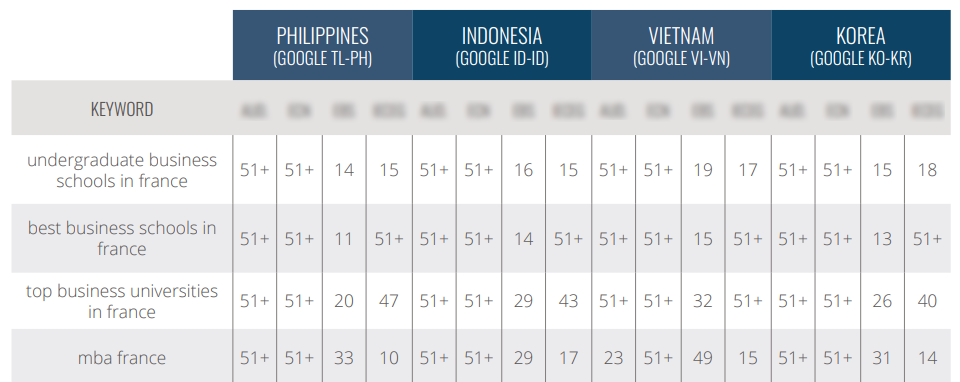 The columns underneath each country represent different schools, including your own. This way, your team can quickly analyze your school’s performance in relation to its competitors and potentially discover areas for improvement. You can even go a step further by dissecting the different metrics – like monthly search volume, difficulty ranking, and cost per click – to determine your cluster keyword.