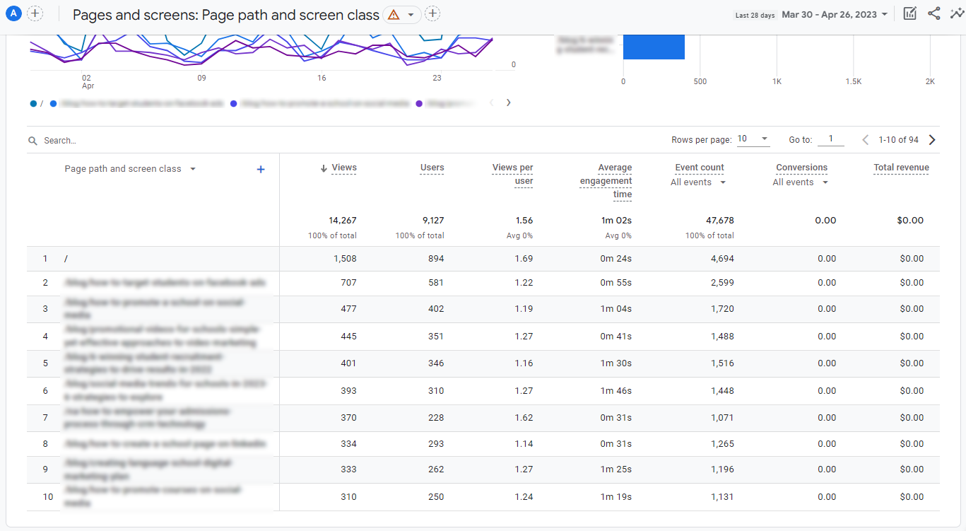 You can use Google Analytics 4 (GA4) to track how web visitors move across your site. Through the platform’s exploration templates, you can follow your user journey and understand how they interact with your school’s content. You can also monitor specific GA4 metrics, like views, average engagement time, and conversion rates, to determine the success of your topic clusters. The screenshot below reveals how this information appears in your GA4 account: