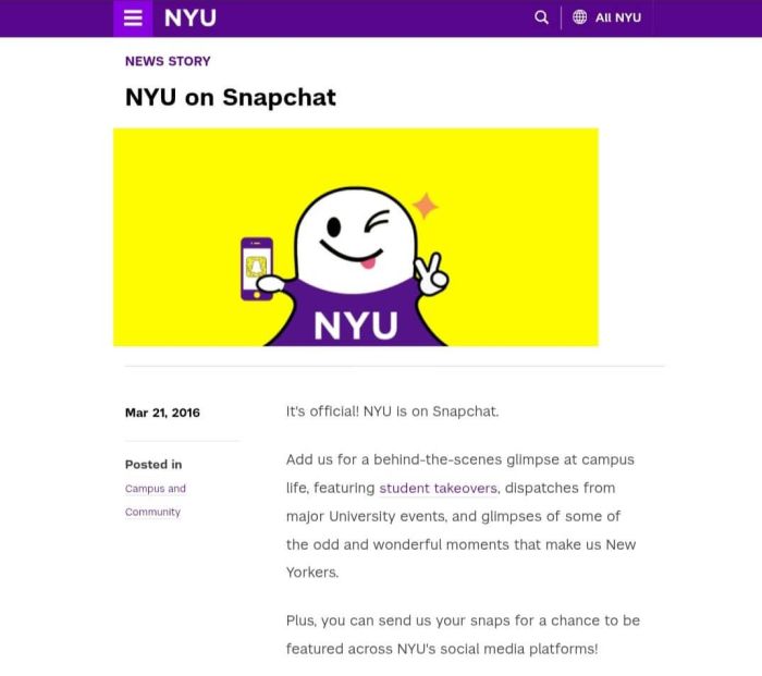 Example: NYU (Snapchat username: nyuniversity) has leveraged Snapchat’s geofilter feature to welcome and engage prospective students. In 2016, NYU introduced a custom Snapchat geofilter for its Admitted Students Day event, even running a student design contest to create the filter. The winning filter gave visiting admits a fun way to announce their presence at NYU on Snapchat. NYU’s official news release also encouraged the community to “Add us on Snapchat” for behind-the-scenes campus glimpses and student takeovers.