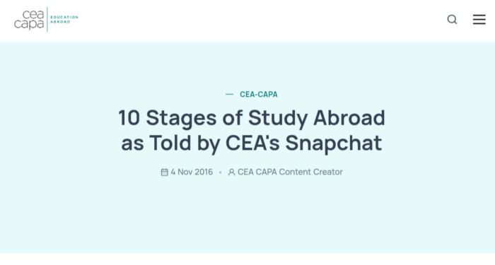 Example: CEA ran a campaign called “10 Stages of Study Abroad,” where students shared their personal journeys through Snapchat, from arrival to cultural experiences. This user-generated content, filled with emojis and candid moments, felt real and approachable, making it an ideal way to engage teens considering studying abroad.