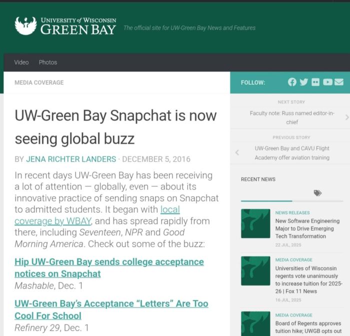 Example: UW–Green Bay’s Snapchat notifications let students engage by snapping selfies back, creating an interactive and memorable admissions experience.