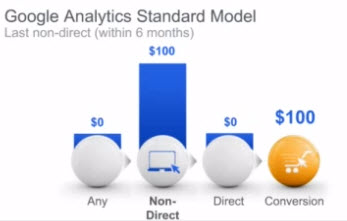 Google Analytics uses a modified last interaction attribution model where the last non-direct step is attributed 100% of the conversion value. This modification means that Google Analytics associates the last channel, other than a direct visit to your website, as the most important , and therefore most valuable touch. Note that in this attribution model all earlier channel interactions, regardless of the number, are attributed with $0.
